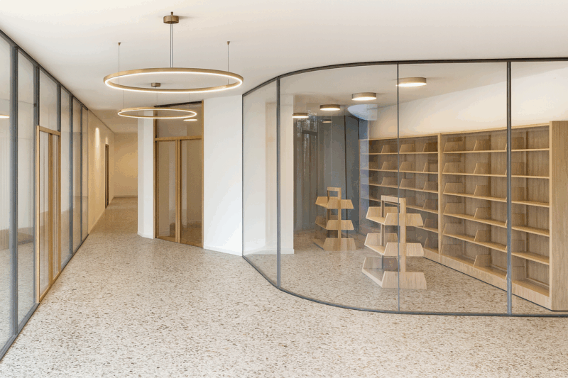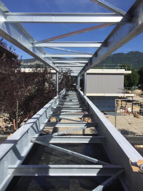 Elle est une des pièces maîtresse du projet puisqu’elle permet la liaison par les étages des bâtiments de l’école existante (élémentaire) et de l’extension (maternelle et restaurant scolaire) tout en maintenant au rez-de-chaussée une traversée piétonne publique qui est structurante dans l’organisation urbaine du chef-lieu de Neydens.