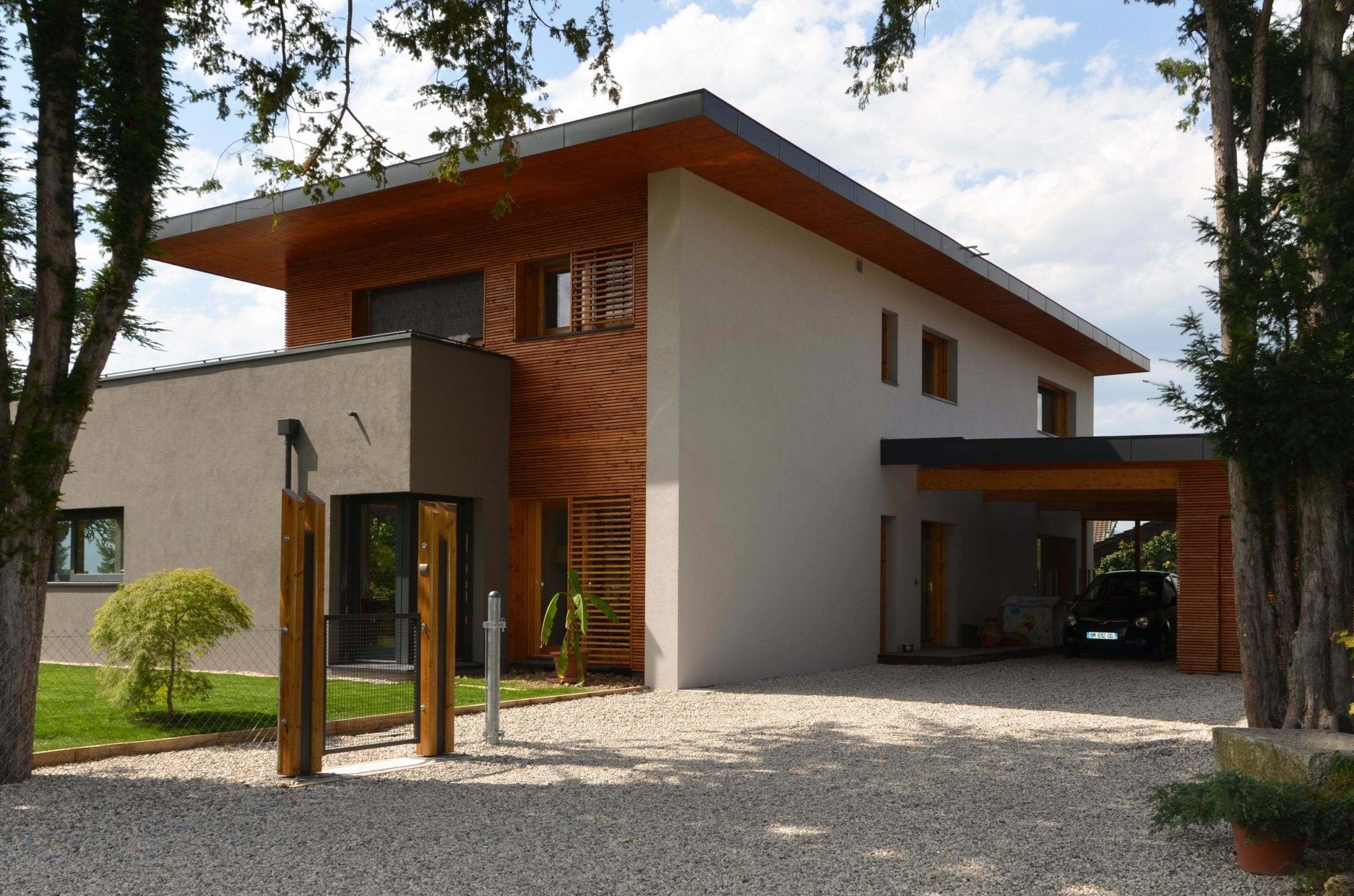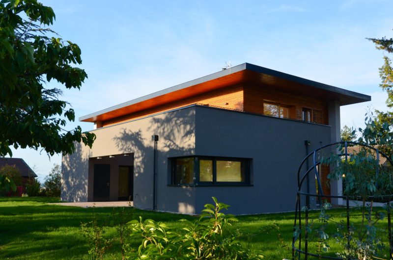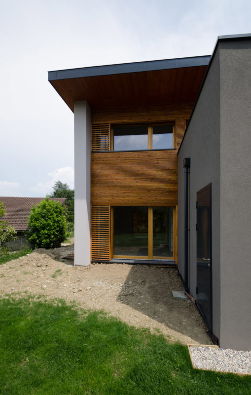 Les couleurs ont été choisies de manière à marquer le contraste entre les bardages bois colorés et les deux murs caractéristiques de la maison: l’assise dans un ton gris-rouge foncé et le grand mur dans les teintes gris clair. La zinguerie et la serrurerie ont été réalisées en teinte gris anthracite et soulignent avec finesse les arêtes des volumes. Les toitures plates sont végétalisées et s’inscrivent dans la démarche énergétique et esthétique de la villa.
