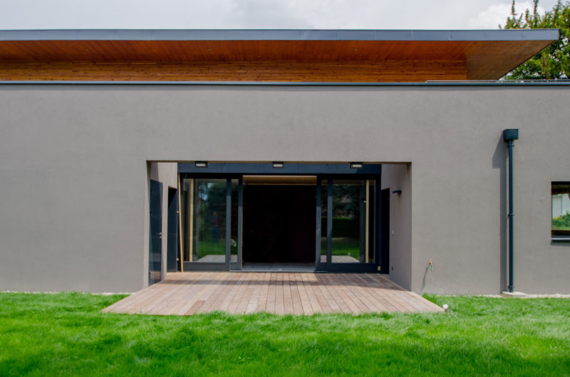 Un troisième volume accueille le garage et porte une seconde toiture filante qui s’appuie contre le grand mur créant ainsi un espace couvert qui protège les accès et apporte de la lumière par le biais de la couverture en polycarbonate transparent.
