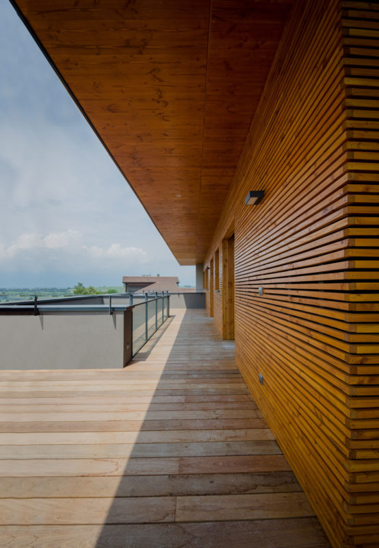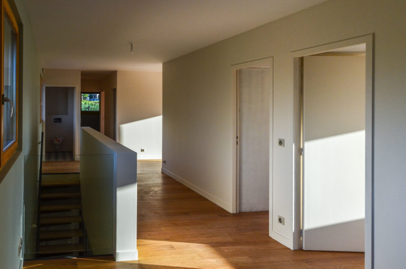 Le second volume est créé par un grand mur sur deux niveaux qui ferme la maison sur les façades Est et Nord et qui supporte la toiture filante. L’espace créé entre dans le bloc de l’assise et ce mur vient générer tous les espaces de bureaux et de chambres, qui eux-mêmes s’organisent autour de circulations traversantes généreuses en termes de dimensions et de lumières.
