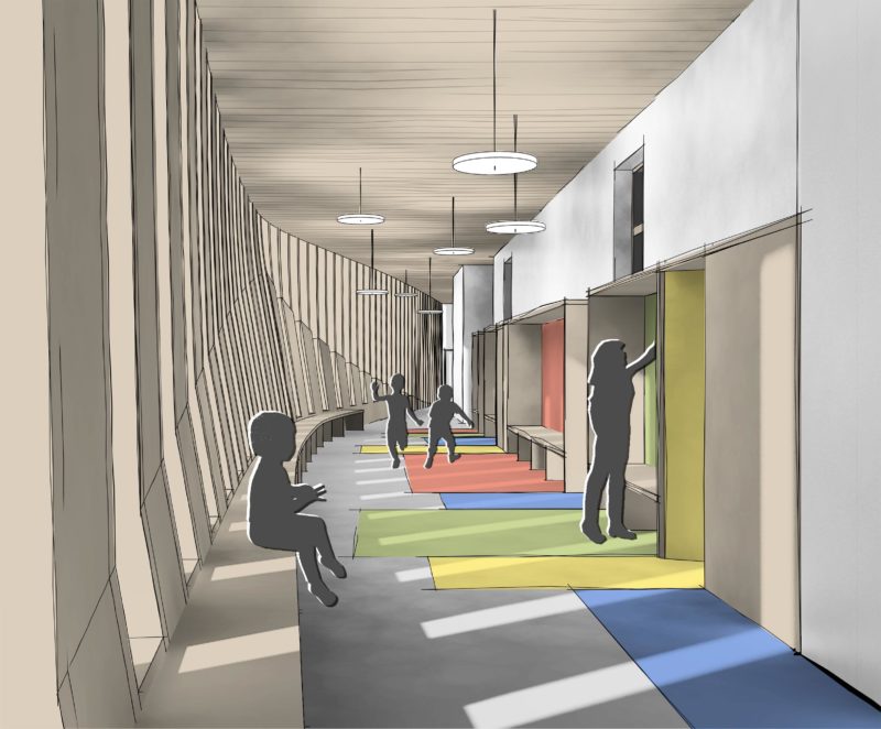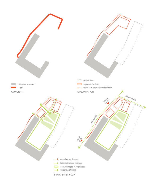 L’implantation classique des bâtiments scolaires existants forme une enceinte protectrice autour de la cour de récréation. Notre projet s’inscrit dans cette logique en créant une circulation à l’arrière du bâtiment historique, et en la prolongeant par un geste souple qui referme l’espace central de la cour et renforce la dimension protectrice de l’ensemble bâti.