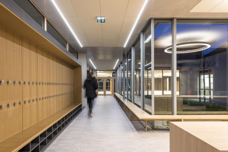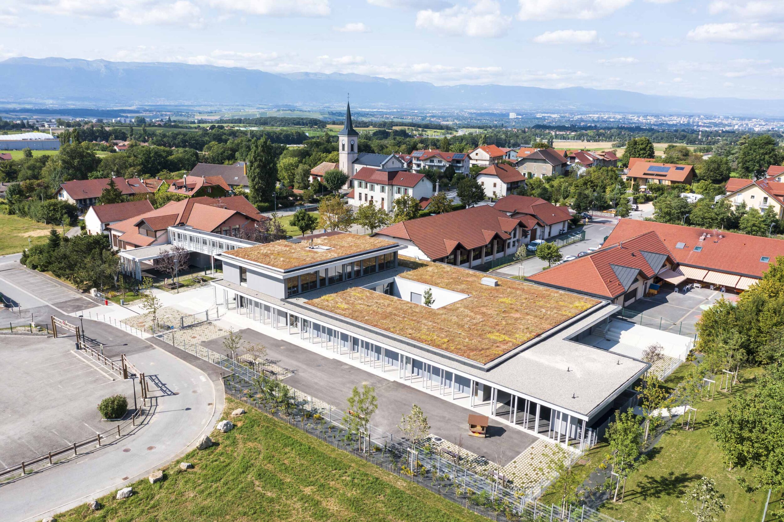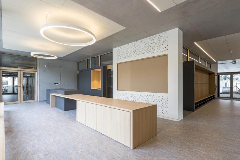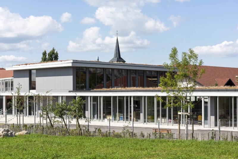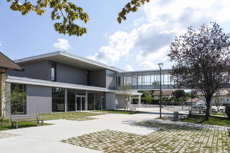 Nous avons pensé le projet en lien avec l’espace public. En connectant l’extension aux bâtiments existants, notamment par une passerelle aérienne, le projet maintien les flux piétons existants et créé une traversée paysagère qui structure l’espace public autour de l’école.