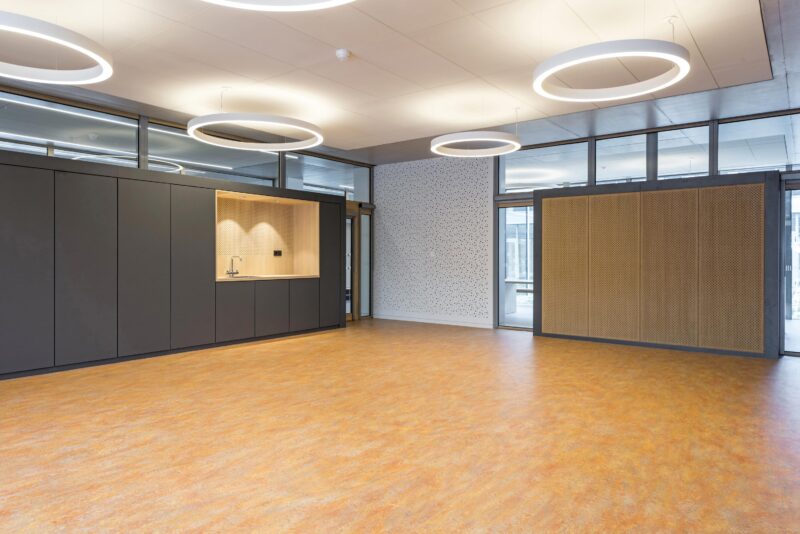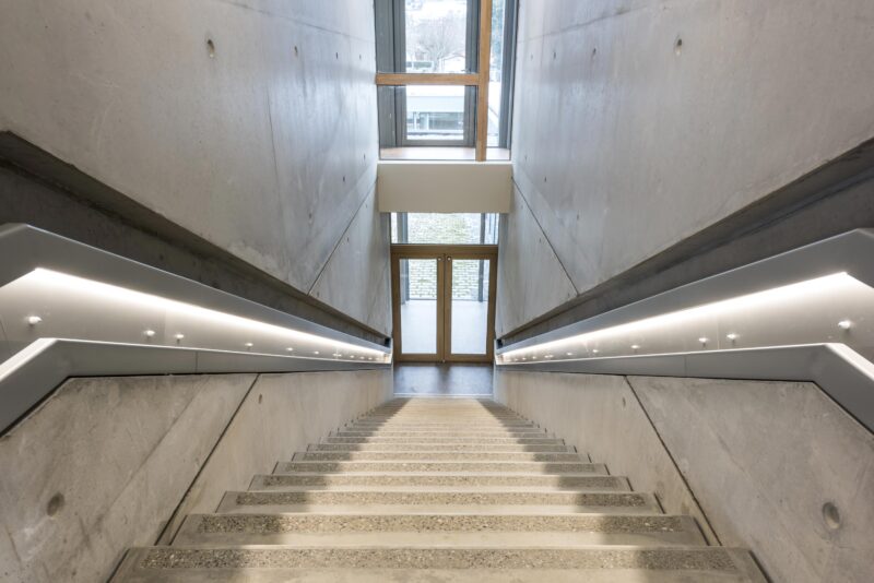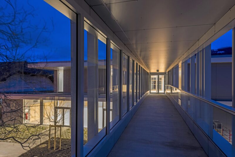 L’extension en elle-même propose une volumétrie épurée et une organisation spatiale simple. Elle prend la forme d’un large bâtiment majoritairement de plain-pied dont les espaces intérieurs s’articulent autour d’un grand patio qui apporte de la lumière naturelle jusque dans les circulations et les espaces secondaires. Les grandes surfaces vitrées mettent en relation les espaces intérieurs avec les nombreux espaces extérieurs faisant l’objet d’un traitement soigné.