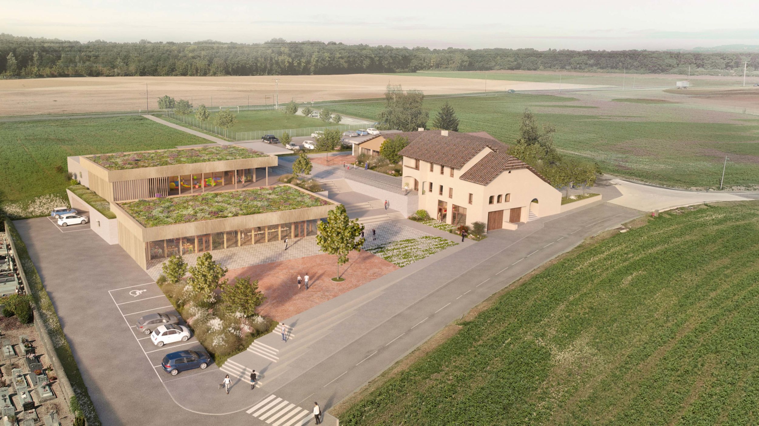 Il en résulte un ensemble de bâtiments distincts qui dialoguent et s’articulent autour d’un cœur ouvert et protecteur. Les deux bâtiments ainsi créés ont des accès différenciés qui s’ouvrent sur deux espaces publics complémentaires : la place du village en partie basse et le square des écoles en partie haute.