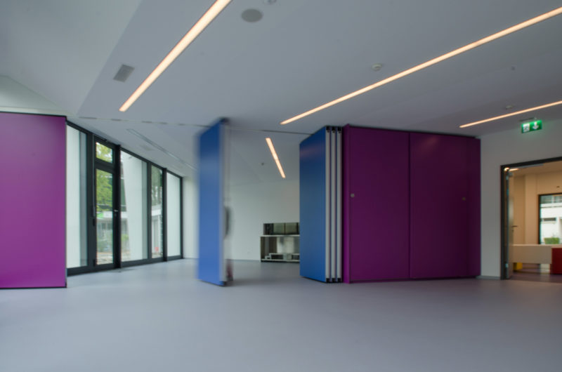 Des puits de lumière ont été créés en toiture. Ils ponctuent les espaces intérieurs animés par des jeux de couleurs.